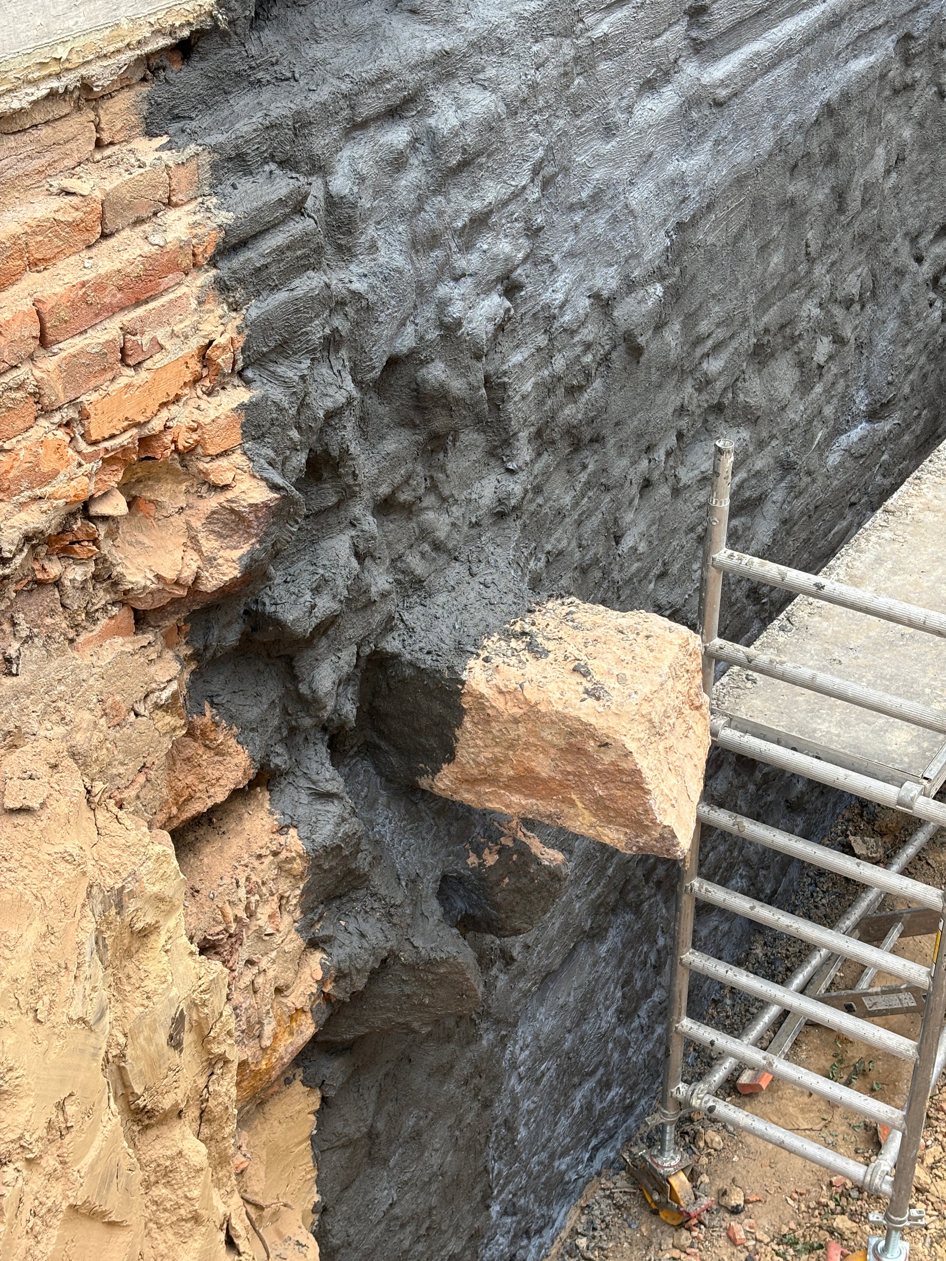 Vnější svislá izolace – živičné stěrky – staré cihelné zdivo s pozůstatky živice >> 🌐 Remmers OUT4